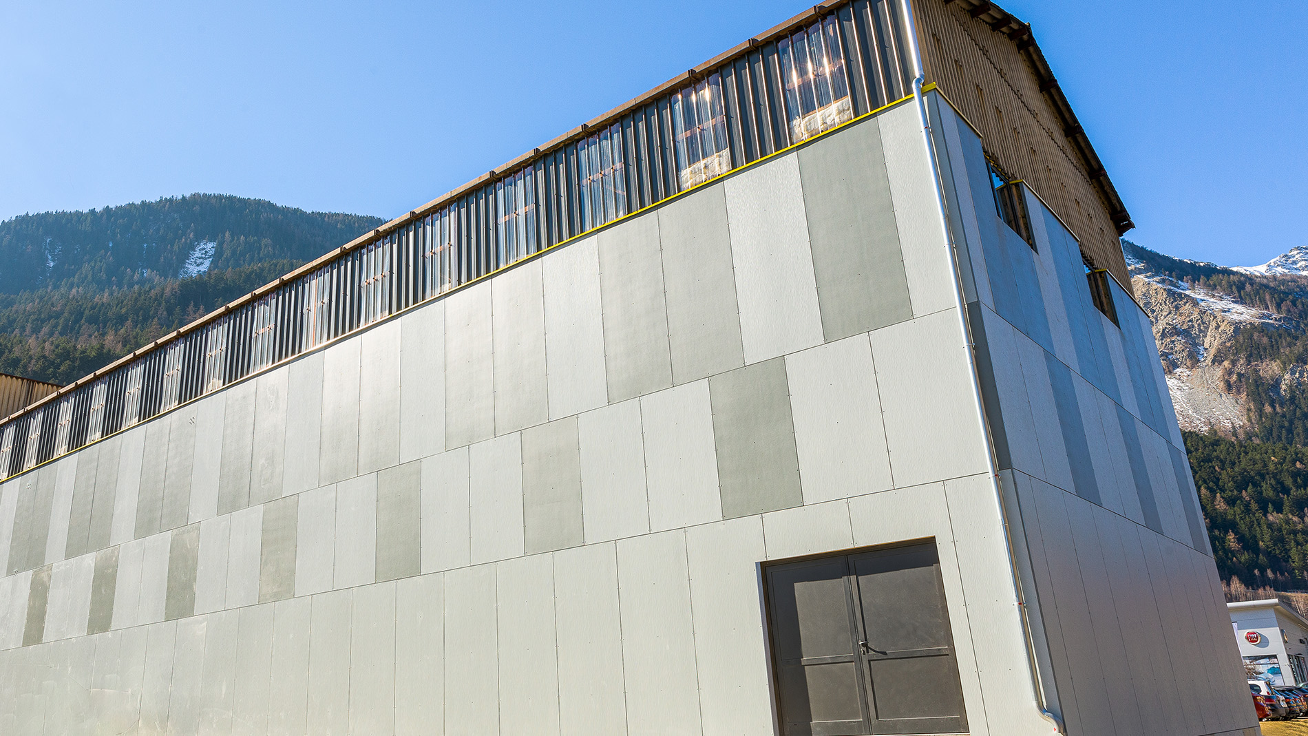 Halle de production présentant un revêtement de façade et une vue grandiose sur le lac de Neuchâtel.